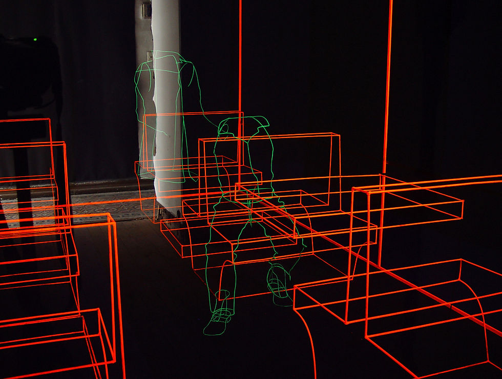 Este proyecto buscaba representar en escala 1:1 a las personas y objetos que integran la cotidianidad de espacios públicos con estructuras lineales de fierro modelado. Las estructuras se pintaron en verde y rojo fluorescente, iluminadas con luz negra creando un efecto de imagen virtual 3D.