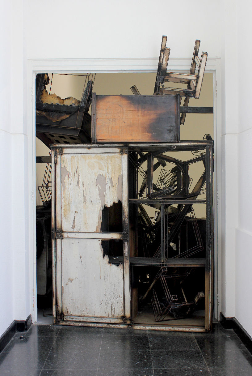 La instalación esta conformada por una serie de muebles en desuso recolectados en México y en Chile; intervenidos con varillas de fierro soldado y fuego. Dispuestos como barricada en uno de los accesos de la sala de exhibición, interrumpiendo el recorrido al interior del Museo.